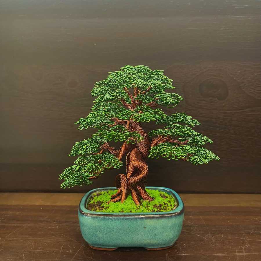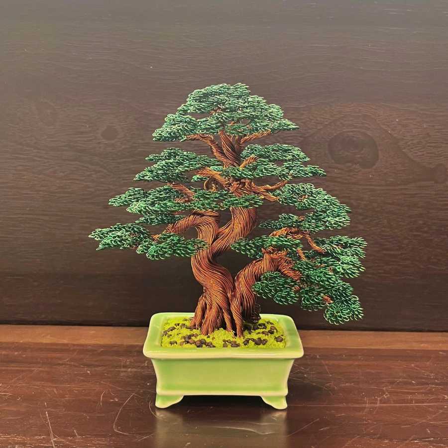 Every bonsai is made from high-quality copper wire, twisted and shaped by hand to mimic the natural growth of real bonsai trees. The dark green leaves bring a soothing, organic contrast to the metallic base.