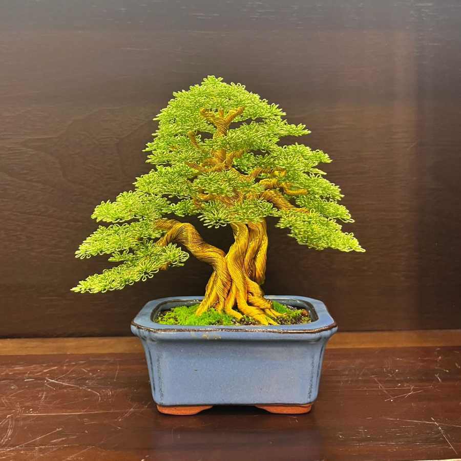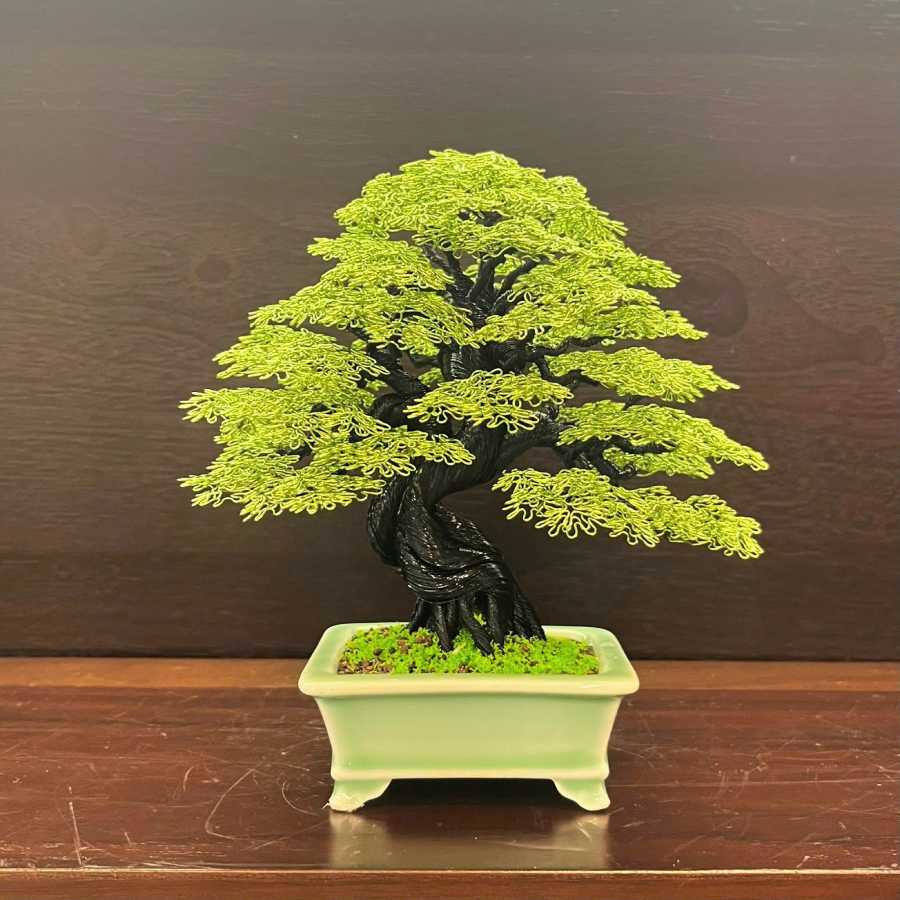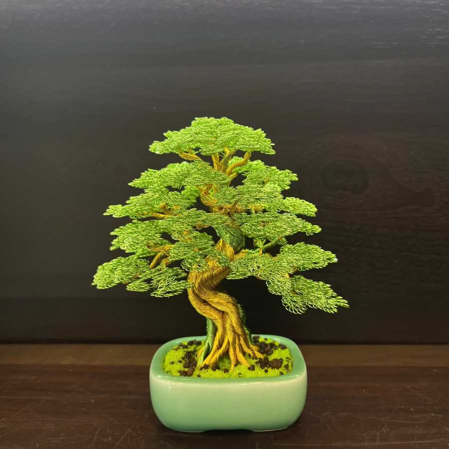 Every bonsai is made from high-quality copper wire, twisted and shaped by hand to replicate the natural growth of real bonsai trees. The light green leaves offer a fresh and soothing contrast to the metallic base.